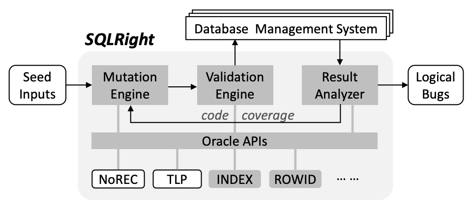 @inproceedings{liang:sqlright,title={Detecting Logical Bugs of DBMS with Coverage-based Guidance},author={Liang, Yu and Liu, Song and Hu, Hong},year={2022},month=aug,address={Boston, MA},booktitle={Proceedings of the 31st USENIX Security Symposium (USENIX)},}